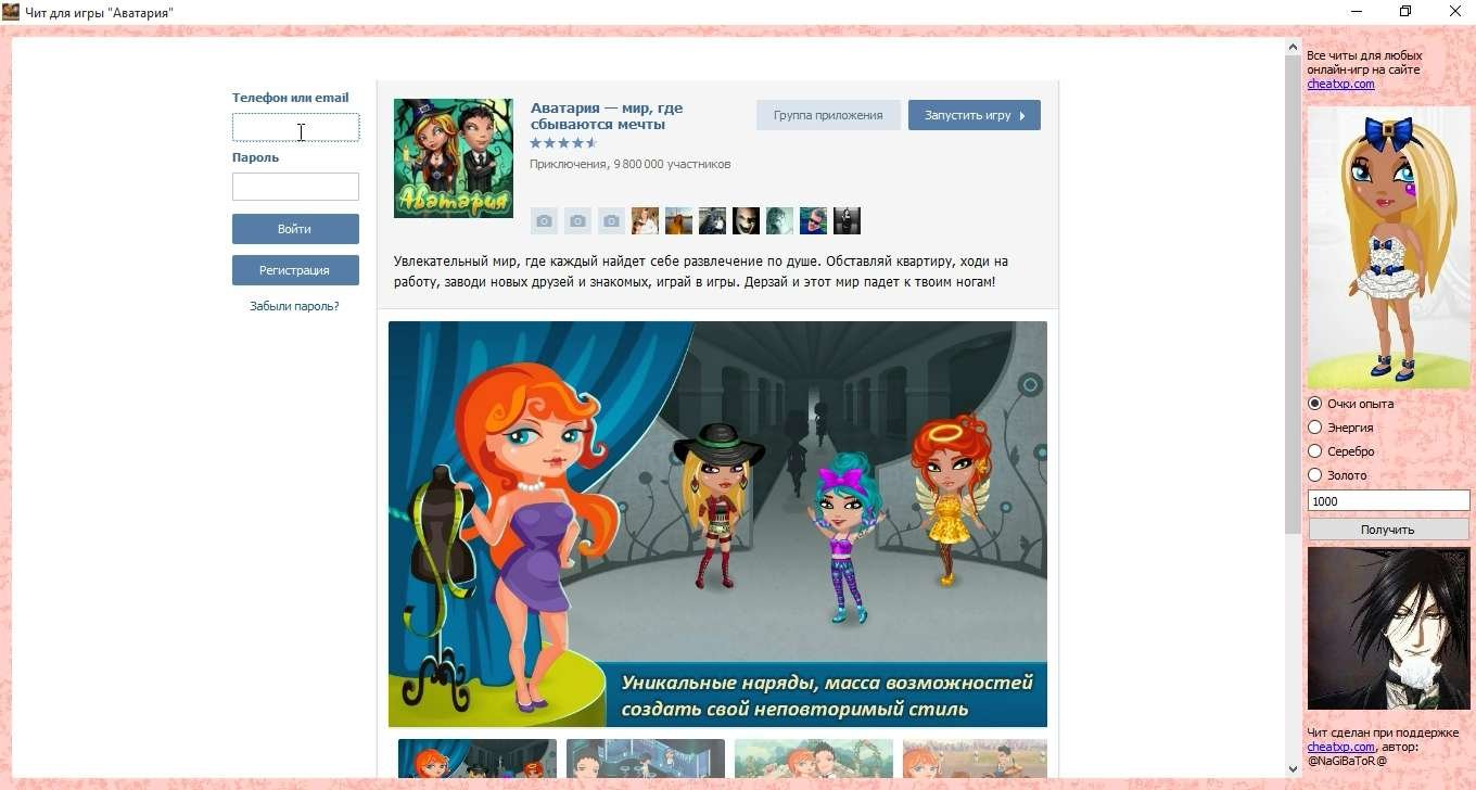 Играешь во Вконтакте в игру Аватария? Тогда тебе точно нужно скачать чит на Аватарию. В Аватарию можно играть в нескольких социальных сетях.Вопрос о том, каким образом заработать в Аватарии читы побольше золота, очень интересует всех поклонников этой игры. Для этого следует накопить самый большой объем энергии и пойти в сад, после скачать чего предпринять такую последовательность действий: Аватария читы на золото и серебро скачать. Только вот программа эта платная.Аватария - это игра, в которой игрок может завести свою виртуальную версию, игрок может выбирать внешний вид и одежду для своего персонажа накрутка золота в аватарии онлайн без скачивания искать друзей и общаться с ними, посещать различные места, украшать свои комнаты,скачать чит на аватарию на монеты работать и заниматься другими интересными занятиями.Можно ли Играть в Аватарию Без Регистрации.К сожалению нельзя играть в Аватарию без регистрации, можно играть онлайн бесплатно, но после регистрации.На третьем заходе джек-пот будет «взят». В игре Аватария каждый игрок может завести себе золото персонажа и жить жизнью этого персонажа — покупать одежду, мебель, ходить в клуб, на пляж, в салон красоты и другие места, общаться и знакомиться с другими игроками и даже жениться после того, как игроки влюбятся в друг-друга.